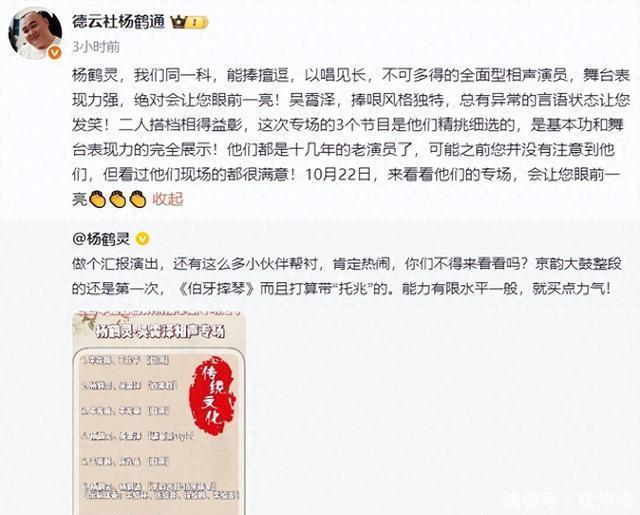 小剧场办专场,对于杨鹤灵、吴霄泽来说是非常适合的,一二百人,刚刚好,能保证票房,能保证上座率,能给演员足够的信息。若是直接去大剧场或者体育馆举办,上座率不佳,票房不佳,对演员来说,这是打击。杨鹤灵晒出专场海报后,杨鹤通帮助宣传,介绍杨鹤灵的时候提到,杨鹤通能捧擅逗,以唱见长,不可多得的全面型相声演员。